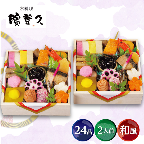 かまぼこ(紅白)、黄金蒸し、綱蒟蒻煮、松風扇面串、伊達巻、ごまめ、有頭海老、さごし柚庵焼、数の子、絹さや、たたき牛蒡、すり身団子(ピンク)、すり身団子(白)、すり身団子(よもぎ)、栗きんとん、竹筒黒豆、棒だら、花豆みじんこ揚げ、松笠海老芋、昆布巻、人参紅梅、大根白梅、花蓮根(赤)、はじかみ