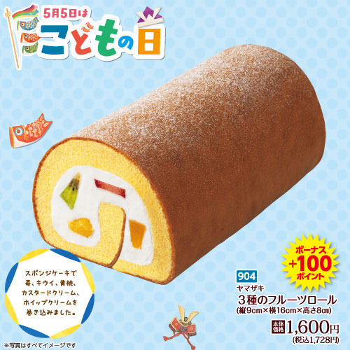 スポンジケーキで苺、キウイ、黄桃、カスタードクリーム、ホイップクリームを巻き込みました。