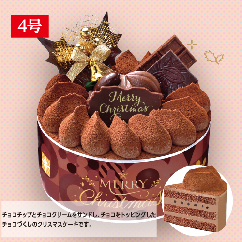 チョコチップとチョコクリームをサンドし、チョコをトッピングしたチョコづくしのクリスマスケーキです。